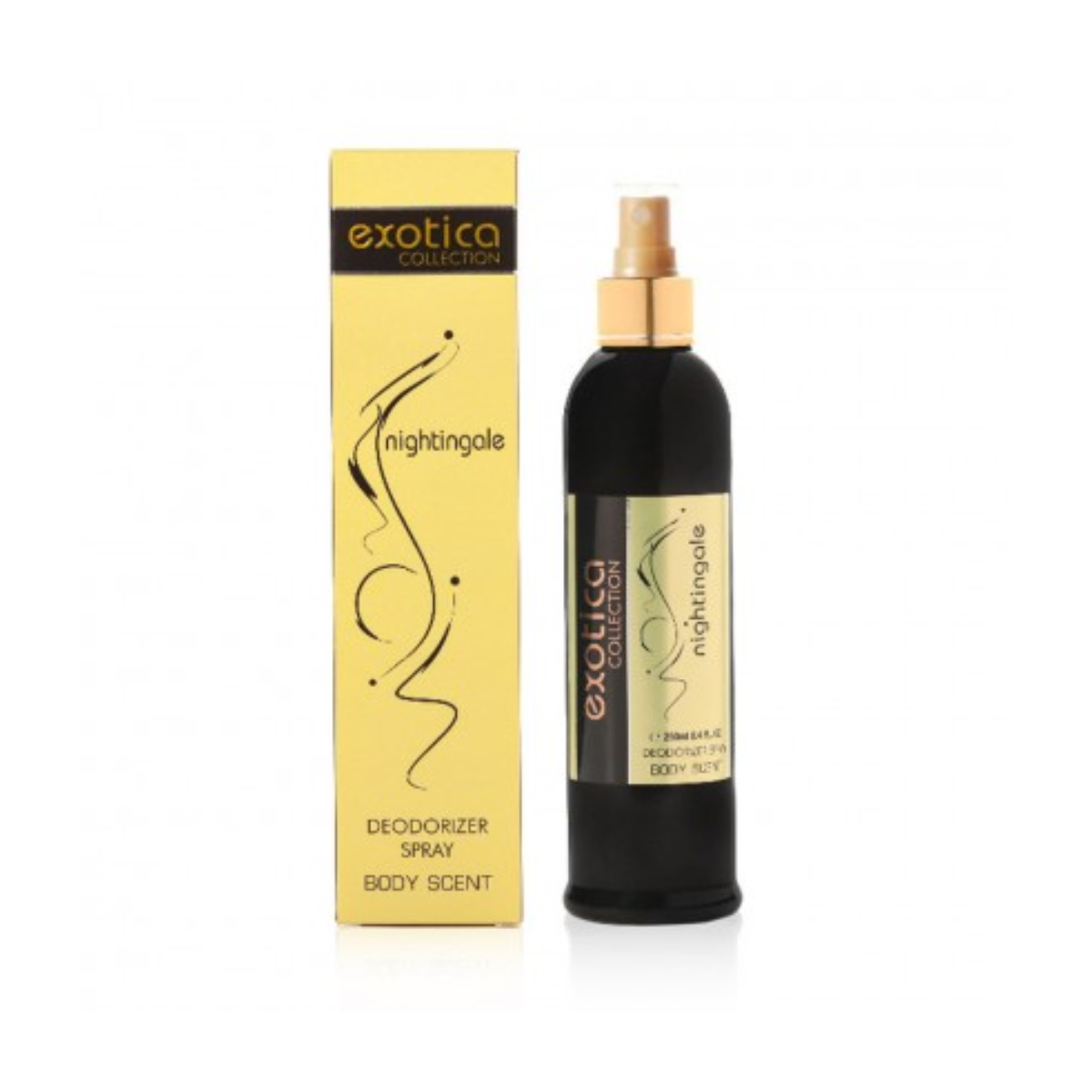 Exotica Nightingale Body Scent is a lighter fragrance mist with a scent profile possibly suggesting floral or melodious notes. It is designed to be refreshing and subtly scent the skin.